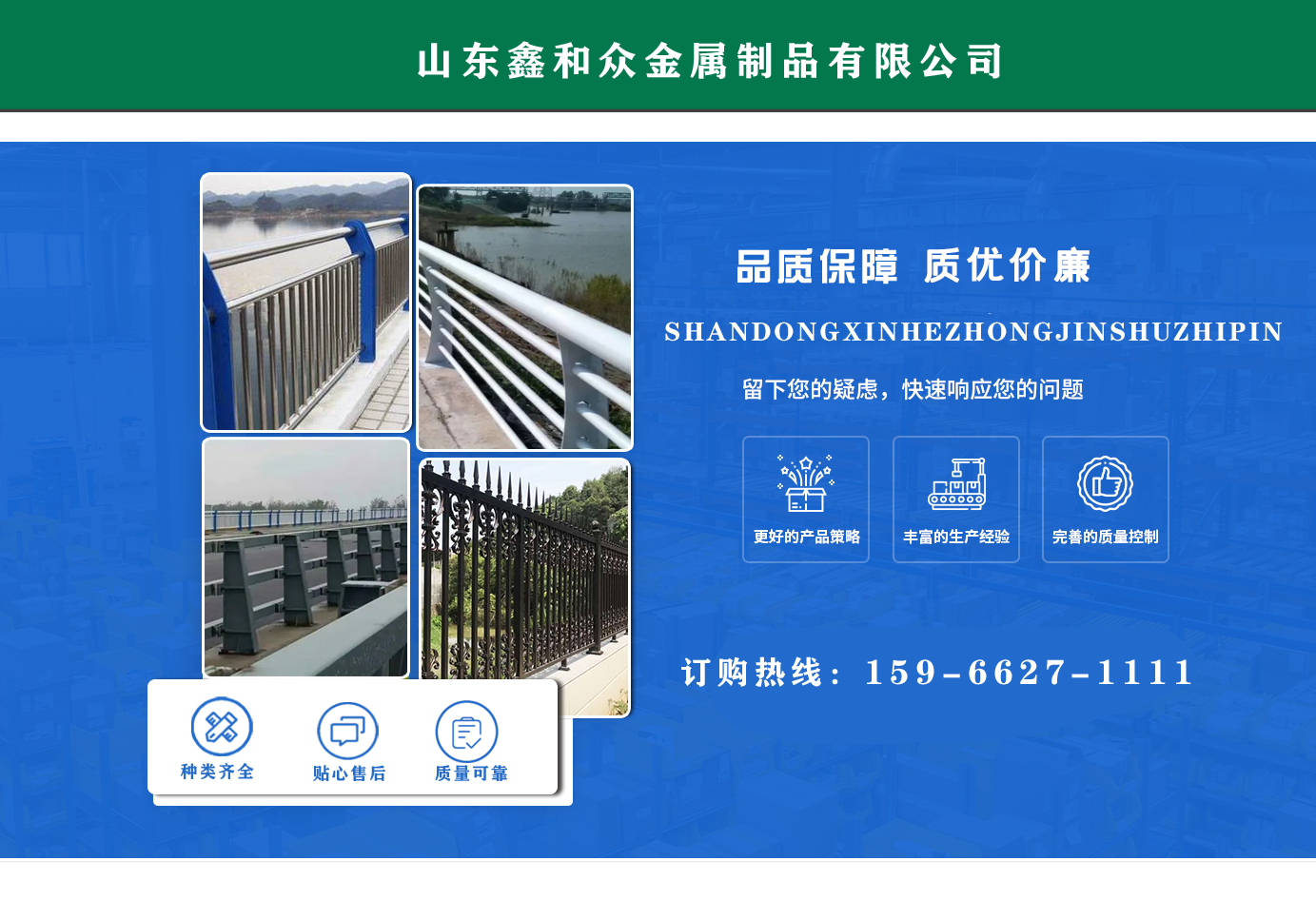 山東鑫和眾金屬制品有限公司主要產品有防撞護欄,橋梁護欄,道路護欄,河道護欄,不銹鋼護欄等護欄。提供設計方案,一站式定制,包您滿意價格優惠,歡迎來電咨詢!    公司常年從事銷售護欄防撞護欄,橋梁護欄,道路護欄,河道護欄,不銹鋼護欄,橋梁鋼護欄,河道燈光護欄等。產品廣泛應用于橋梁、河道、旅游景區、道路、公路、公園、小區、景觀、道路防撞等領域。    公司產品均采用優質不銹鋼材料,符合相關標準。各種型號不銹鋼復合管及護欄,質量嚴格把控。產品強度高、耐腐蝕、焊接牢固、抗沖擊、性能好,防撞護欄結構簡單、美觀實用大方。     歡迎前來訂購!...